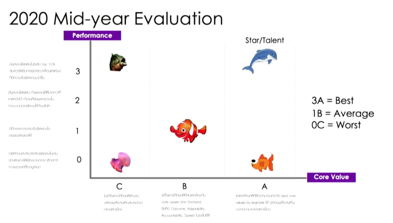 คนที่ได้ 0A คือคนที่ทัศนคติดีเยี่ยม มีเพื่อนเยอะ แต่ทำงานไม่ได้ คนกลุ่มนี้คือ ปลาทอง