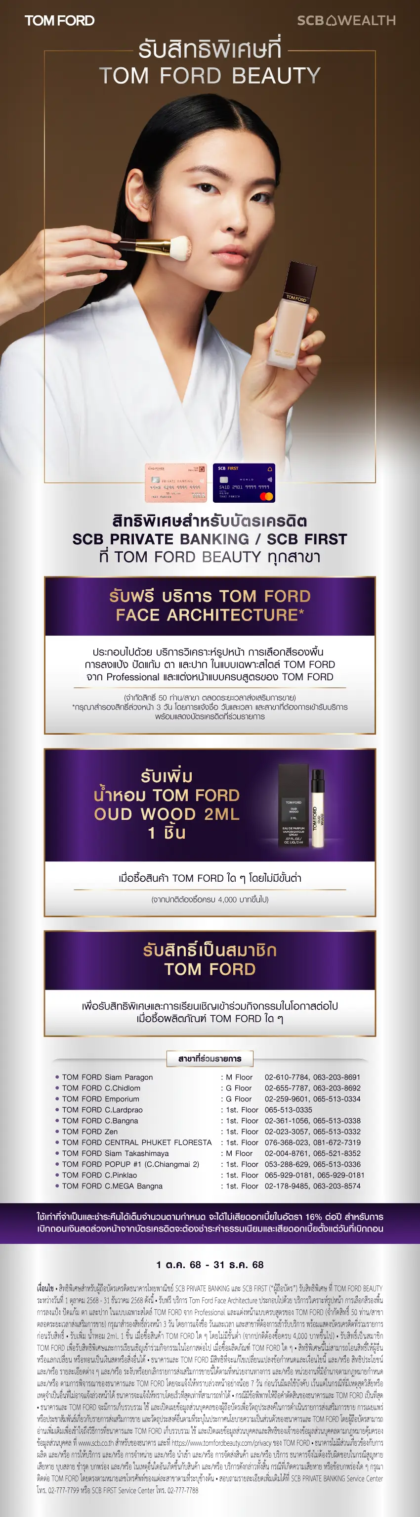 สิทธิพิเศษสำหรับผู้ถือบัตรเครดิต SCB FIRST รับสิทธิพิเศษมากมายที่ TOM FORD BEAUTY (ตามเงื่อนไขที่กำหนด)