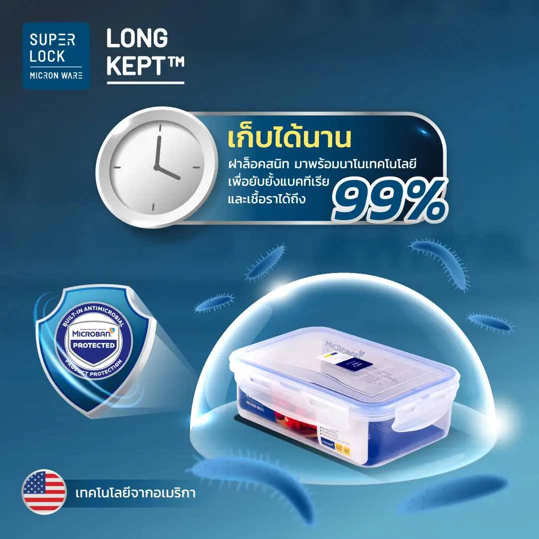 SUPER LOCK เป็นผู้นำเทคโนโลยี “Microban” จากสหรัฐอเมริกา โดยเป็นบริษัทเดียวในประเทศไทยที่ได้รับสิทธิ์ในการใช้เทคโนโลยีนี้ในผลิตภัณฑ์ประเภทเครื่องใช้พลาสติก ซึ่งช่วยยับยั้งเชื้อราและแบคทีเรีย ยืดอายุอาหาร และเพิ่มความสะอาดปลอดภัย ถือเป็นการยกระดับมาตรฐานใหม่ให้กับตลาดกล่องใส่อาหารในประเทศไทย