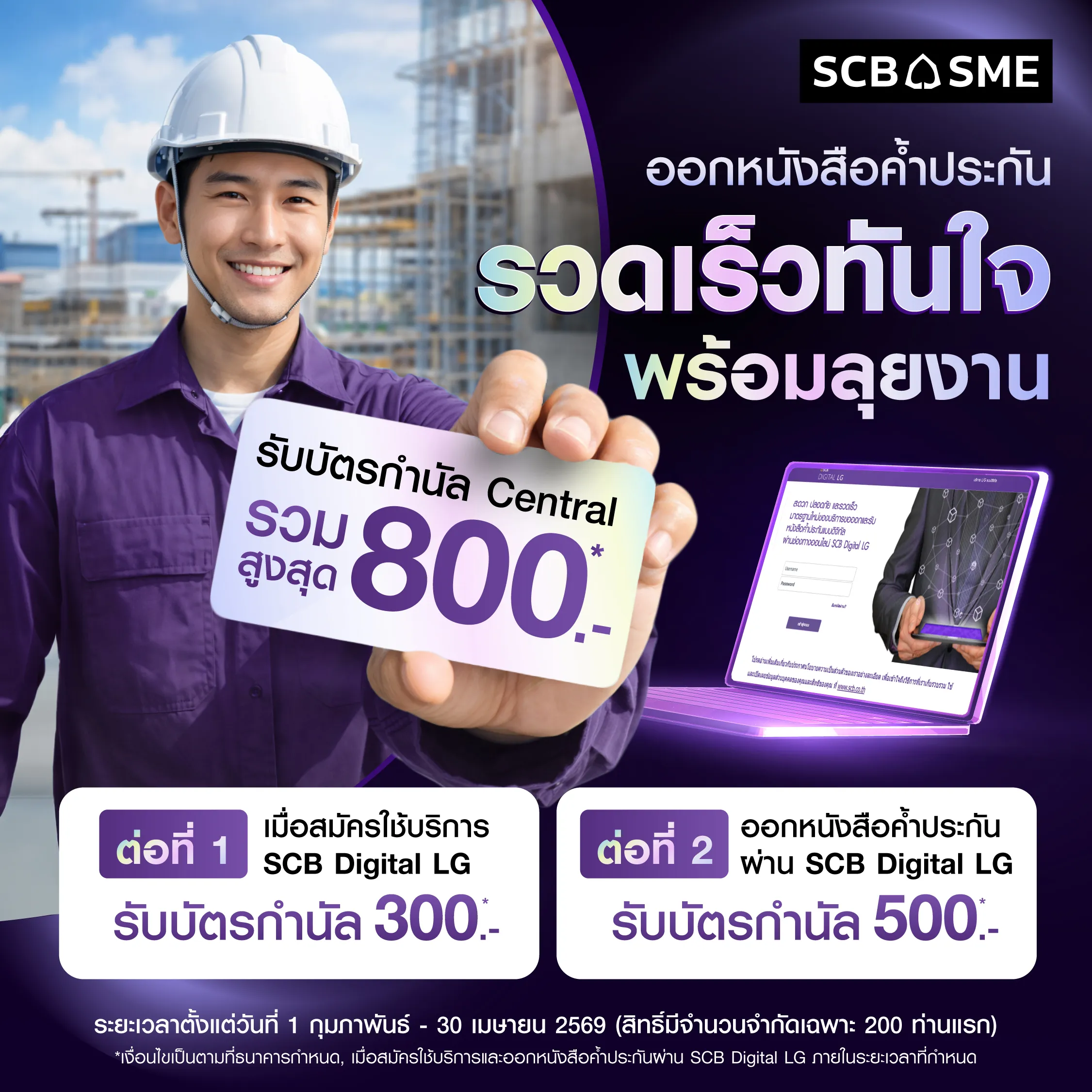 2. สิทธิพิเศษนี้สำหรับลูกค้านิติบุคคลที่ สมัครใช้บริการ SCB Digital LG และ ออกหนังสือค้ำประกันผ่าน SCB Digital LG ระหว่างวันที่ 1 กุมภาพันธ์ 2569 – 30 เมษายน 2569 (ระยะเวลาส่งเสริมการขาย) เท่านั้น