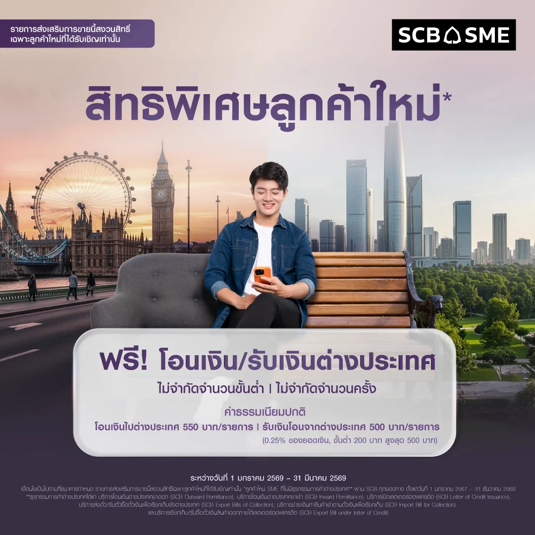 1. รายการส่งเสริมการขายนี้ สงวนสิทธิ์เฉพาะลูกค้าที่ได้รับเชิญเท่านั้น และเป็นลูกค้า SME ที่ไม่เคยมีธุรกรรมการค้าต่างประเทศ* ผ่านธนาคารไทยพาณิชย์ จำกัด (มหาชน) (“ธนาคาร”) ทุกช่องทาง (ศูนย์ธุรกิจต่างประเทศ หรือ ช่องทางออนไลน์ของธนาคาร หรือ ช่องทางอื่นๆ ตามที่ธนาคารกำหนดเพิ่มเติม) มาก่อน ตั้งแต่วันที่ 1 มกราคม 2567 – 31 ธันวาคม 2568 โดยมีระยะเวลาแคมเปญตั้งแต่วันที่ 1 มกราคม 2569 – 31 มีนาคม 2569